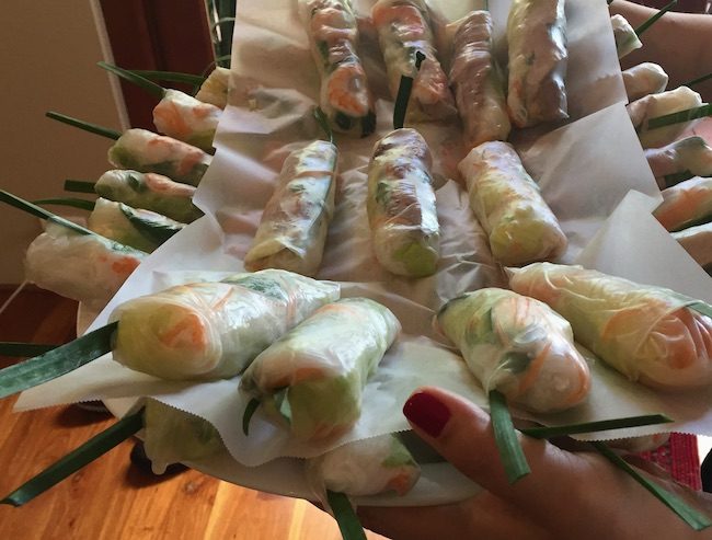 今日わたしが行ったのは学校の外国語科教師たちのクリスマスランチだ。フランス語教師の家の広い庭で行われたパーティーで、主催者は大きなハムのかたまりとバーベキューのソーセージを供し、招かれた教師たちは各々何か持ってきた。ほとんどがサラダ(ポテトサラダ、チキンサラダ、クスクスとベビーグリーンのサラダ)だったので、わたしは例年つくっている生春巻きを作ることに。