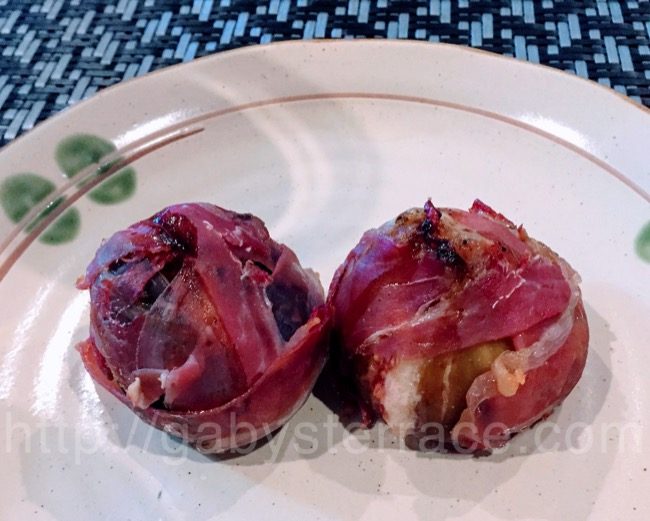 それでもイチジクに十文字の切れ目を入れて、そこにブルーチーズを押し込み、その「取りあえずの生ハム」を貼り付けてみた。なんと見た目の悪いことよ。まるでパッチワークだ。