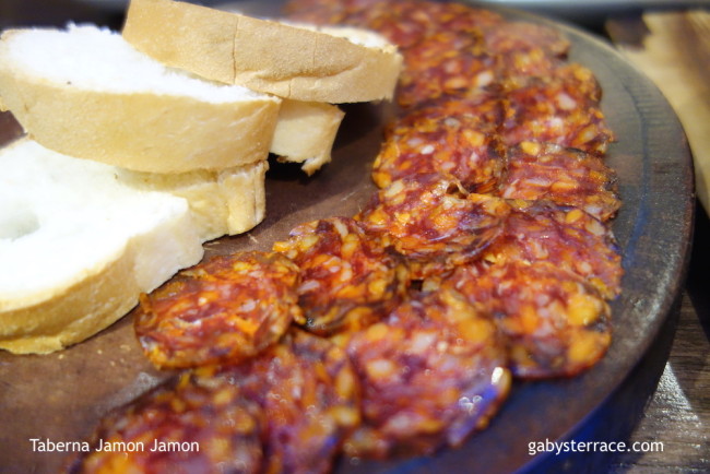 とてつもなく大きいメニュー(いや、本当に大きくてテーブルの半分ほど)には、野菜料理がほとんどない。カワキモノとアゲモノだけで、肉料理やパエヤなどもない。とりあえずサラダと冷たいトマトのスープを注文。そして、チョリソーとスペイン生ハムのハモン、アヒージョ、フライドポテト。なんだか胃がもたれそうなメニューだ。「タパス」と言っているが、それにしても一皿の量が多い。ひとり分の量が尋常じゃないほど多いオーストラリアのレストランでも、スペイン料理屋のタパスだけは少量なんだけどなあ。