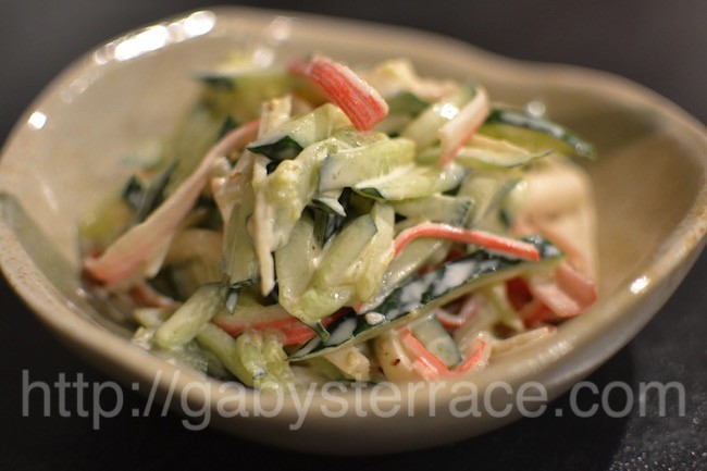 カニカマを「裂く」なんてめんどくさいことはキライなので縦に細く切り、きゅうりも細切りにして塩をひとつまみふってから、ぎゅうと絞る。マヨネーズにちょいと醤油とごま油をたらし、ゴマをひとふりしてからカニカマときゅうりを放り込んでざっくり混ぜた。