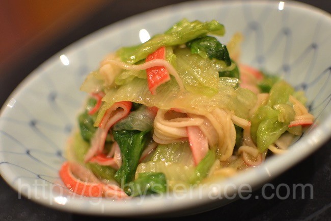 レタスがしんなりとする前にカニカマを加え、オイスターソースを回しかけてざっと和えたらできあがりだ。あまり炒めすぎるとレタスがふにゃふにゃになってしまう。