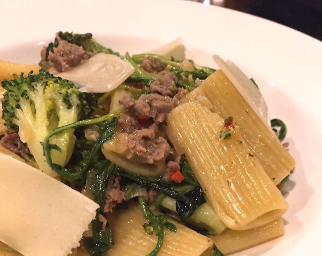 ここに叩いてみじん切りにしたアンチョビと「袋から出してしまった生ソーセージ」を放り込む。火が通ったら、チキンスープを少々加えて火を中火にしてからコトコトと10分ぐらい。あとはルッコラの葉とバルサミコ酢を大さじ1杯ぐらい加え、そこに茹で上がったブロッコリとパスタを入れて混ぜあわせ、パルミジャーノをガリガリ削ってオシマイ。