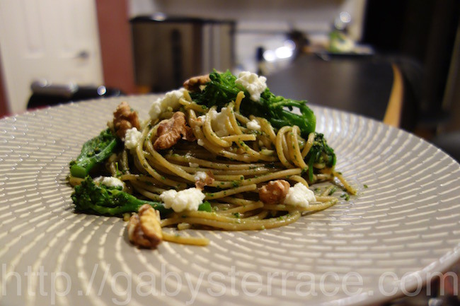 大鍋に湯を沸かし、塩をひとつかみ。そこにスパゲッティーを入れ、最後のほうでブロッコリー二と呼ばれるブロッコリーを長くしたような野菜も一緒にゆでてしまう。あとはペストを混ぜあわせてから、ブロッコリーニを加え、クルミとフェタチーズをぱらぱらと散らす。