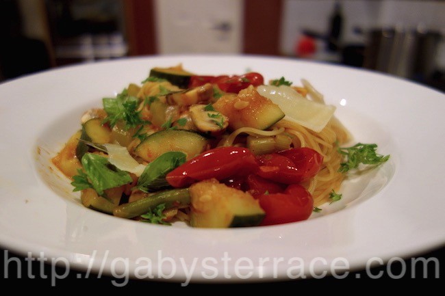 茹で上がったカッペリーニにソースを半分加えて皿に盛り、さらに野菜ごろごろのソースを上からたっぷりかけ、庭のパセリとバジルを振りかけ、最後に削ったパルミジャーノを散らした。